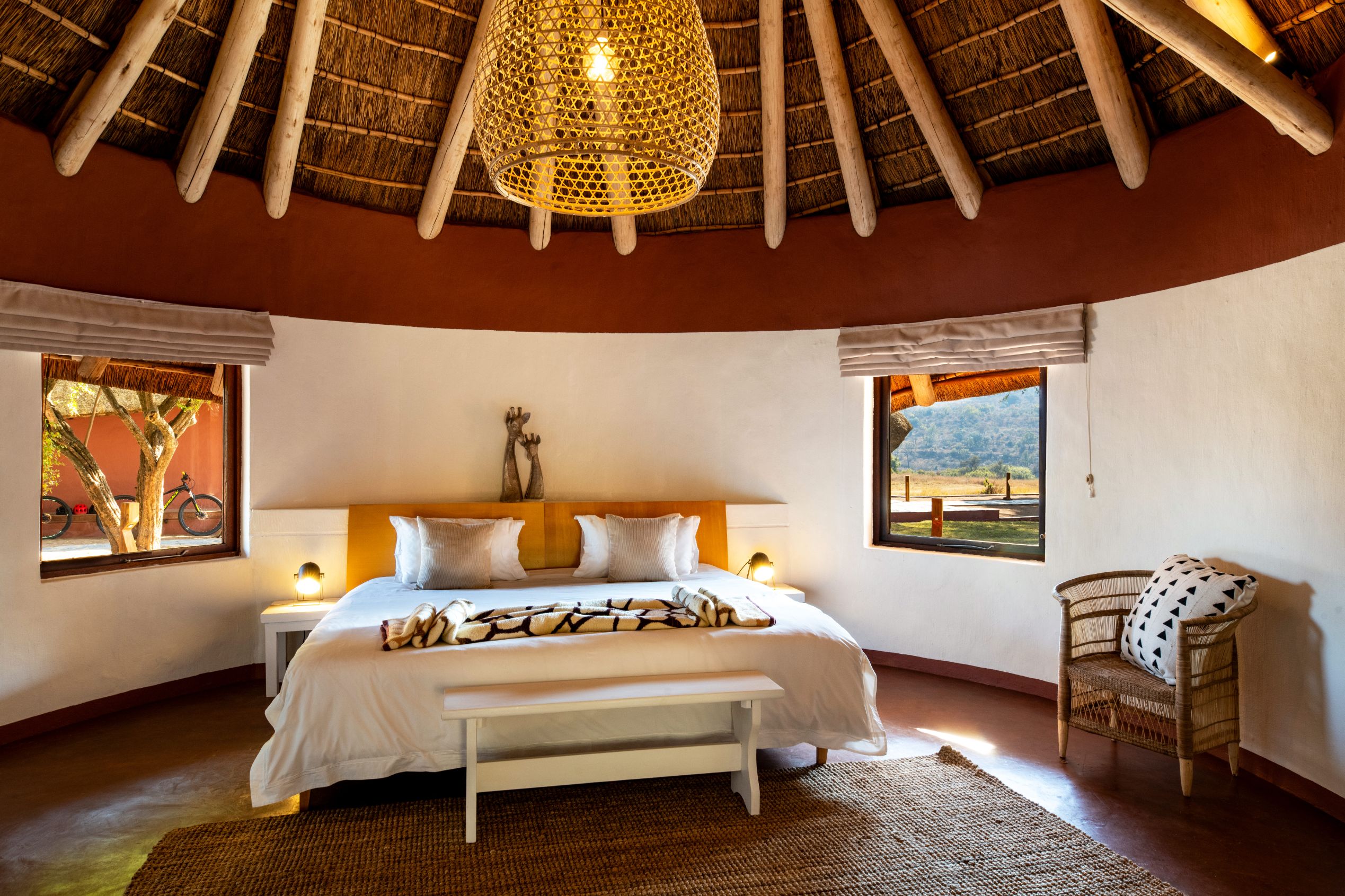 The complex has beautifully landscaped grounds, classy and comfortable thatched chalets and a large common area with a main lounge, outdoor seating and a pool. The main lounge includes an open plan dining/lounging area around a fireplace, and a terrace with an outdoor boma. There is also an extensive system of walking and biking trails (bikes provided). Afternoon game drives are offered (with sundowners), along with guided “wet-walks around rock pools in the river that runs through the reserve.” The complex’s resident wildlife includes zebras, kudus, nyalas, impalas, giraffes, hartebeest and blesbok, but we saw none of them. Visitors can also do self-guided walks along marked trails, which we opted to try on our full day here.